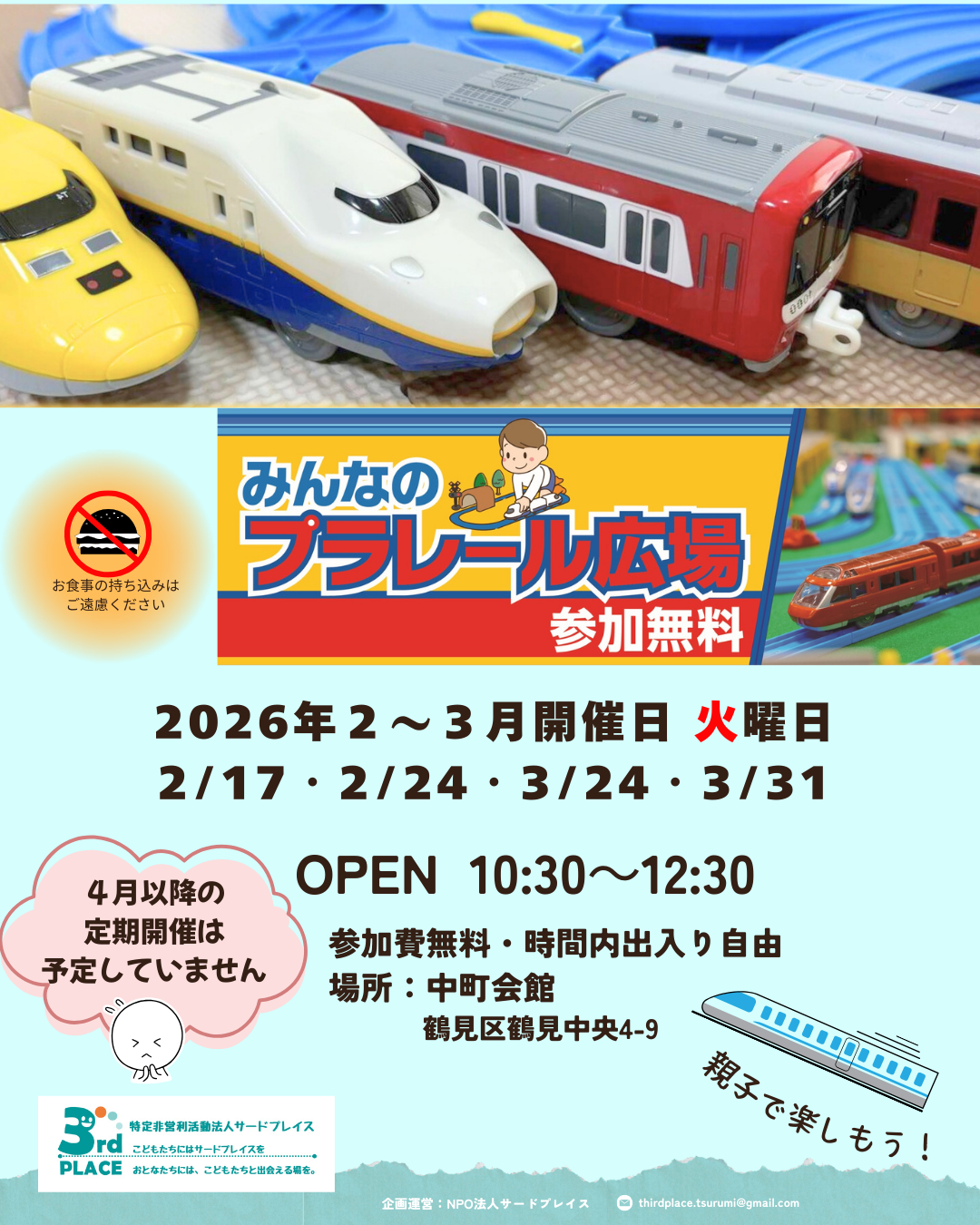 親子で楽しもう!みんなのプラレール広場 2026年2月10日2026年2月12日 | イベント 中町会館で「みんなのプラレール広場」を開催しています!2月~3月の開催は2月17日(火)2月24日(火)3月24日(火)… 続きを見る