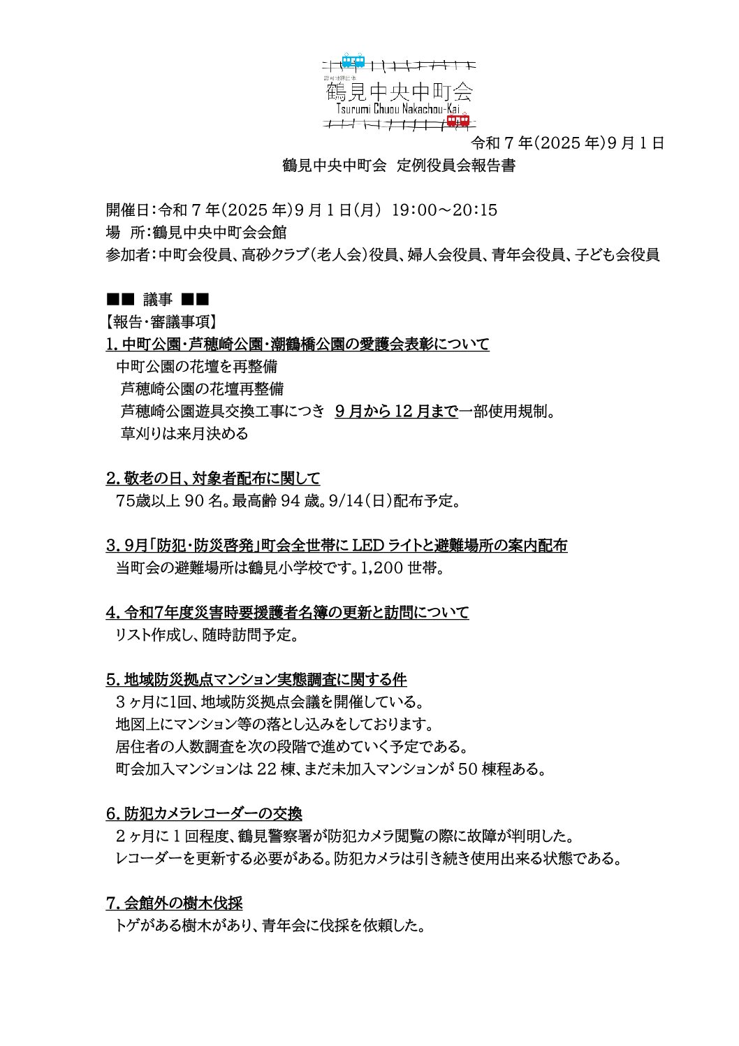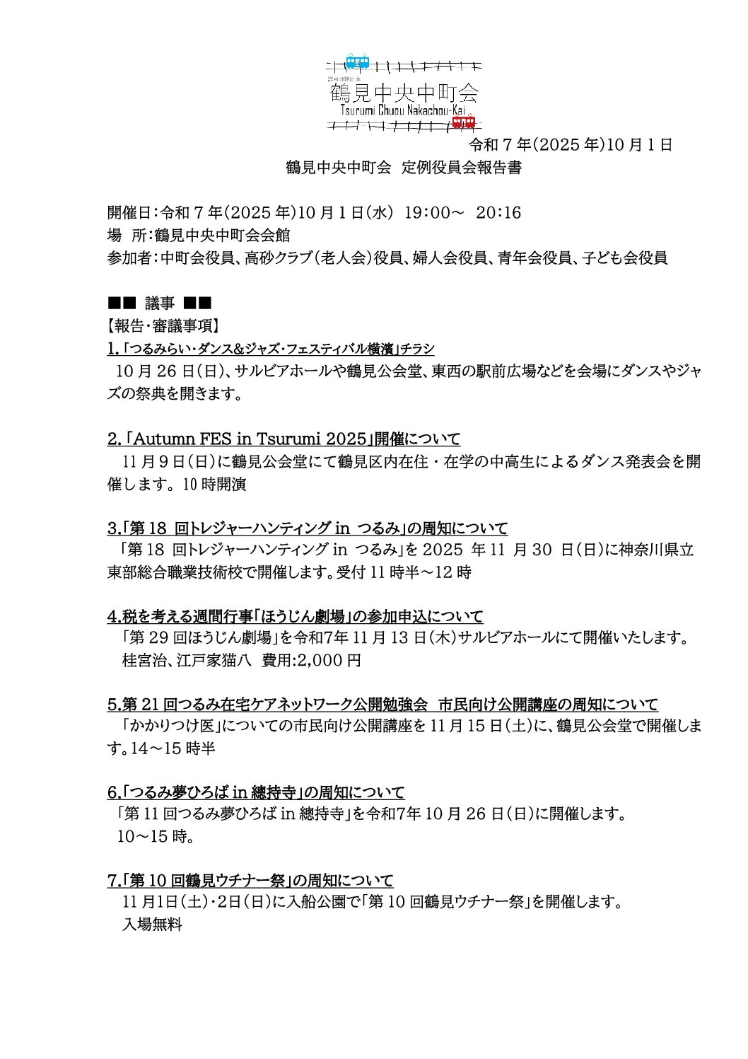 ホーム 2024年07月03日2025年08月08日 認可地縁団体 鶴見中央中町会(横浜市)のWEBサイトです。 中町会では中町会会員の皆さまの健康と安心・安全を最優先として活動しています。 最新のお知らせ 役員報告会(令和7年度) 2025年10月11日2025年10月11日 | 役員会報告 2025年10月1日開催 続きを見る 役員報告会(令和7年度) 2025年10月11日2025年10月11日 | 役員会報告 2025年9月1日開催 続きを見る ラジオ体操 2025年8月24日2025年8月24日 | 婦人会, 子ども会, 町内会, 青年会, 高砂クラブ 2025年 8月 18日 (月) から 22(金) にラジオ体操を実施しました。 全日程いいお… 続きを見る 会員募集「鶴見中央ペットの会」 2025年8月8日2025年8月8日 | 町内会 「鶴見中央ペットの会」の発足に伴い、会員を募集します!8月末までのご入会で、無料でペットの写真入り名刺をプレゼントします… 続きを見る 全てのおしらせ 当サイトの目次 おしらせ 町内会・各会・委員会などからの最新のおしらせを掲載しています。全てのおしらせ( 町内会 役員会報告 子ども会 高砂クラブ 婦人会 青年会 ) 中町会 鶴見中央中町会の会長あいさつ、活動内容や町会の範囲、歴史などを掲載しています。 各会 子ども会・育成会、高砂クラブ、婦人会、青年会の活動内容を掲載しています。 委員会 家庭防災員、ヘルスメイト、スポーツ推進委員、民生委員、消費生活推進委員、アイネット推進委員の活動内容を掲載しています。 防災・防犯 防災に関する情報を掲載しています。防災拠点・ハザードマップなど。 防犯に関する情報を掲載しています。 会員募集 各会へ入会するためのフォームです。 リンク集など 中町会に関する便利リンクを掲載しています。 その他当サイトについてやプライバシーポリシーを掲載しています。