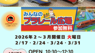 イベント 親子で楽しもう!みんなのプラレール広場 中町会館で「みんなのプラレール広場」を開催しています!2月~3月の開催は2月17日(火)2月24日(火)3月24日(火)3月31日(火)10:30~12:30の開催です。出入りは自由です。ぜひご来館ください。※なお、2026年4月以降の定期... 2026年02月10日 イベント